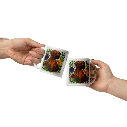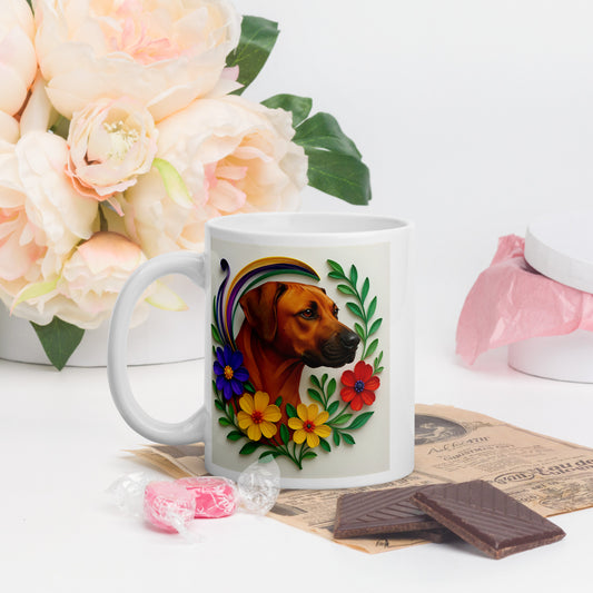 White Glossy Mug, Rhodesian Ridgeback, Floral #2