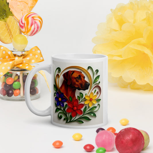 White Glossy Mug, Rhodesian Ridgeback, Floral #3