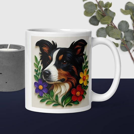 White glossy mug, Border Collie (tri), floral