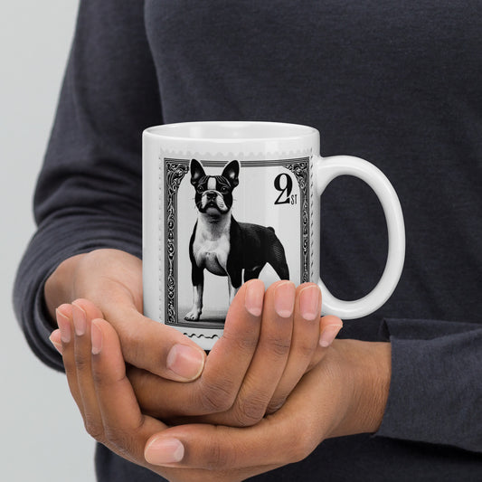 White glossy mug, Boston Terrier, postage